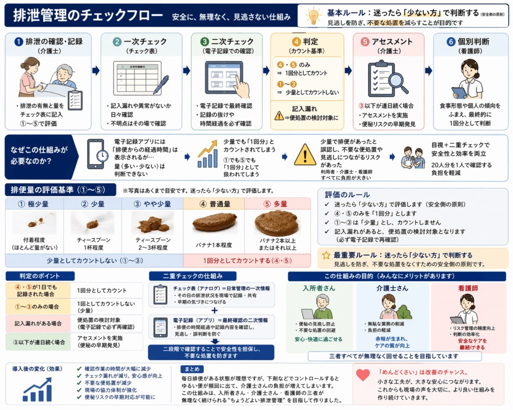 - 紙媒体で1ヶ月分の一覧表を作成。十分な排便あれば介護士が〇をつける